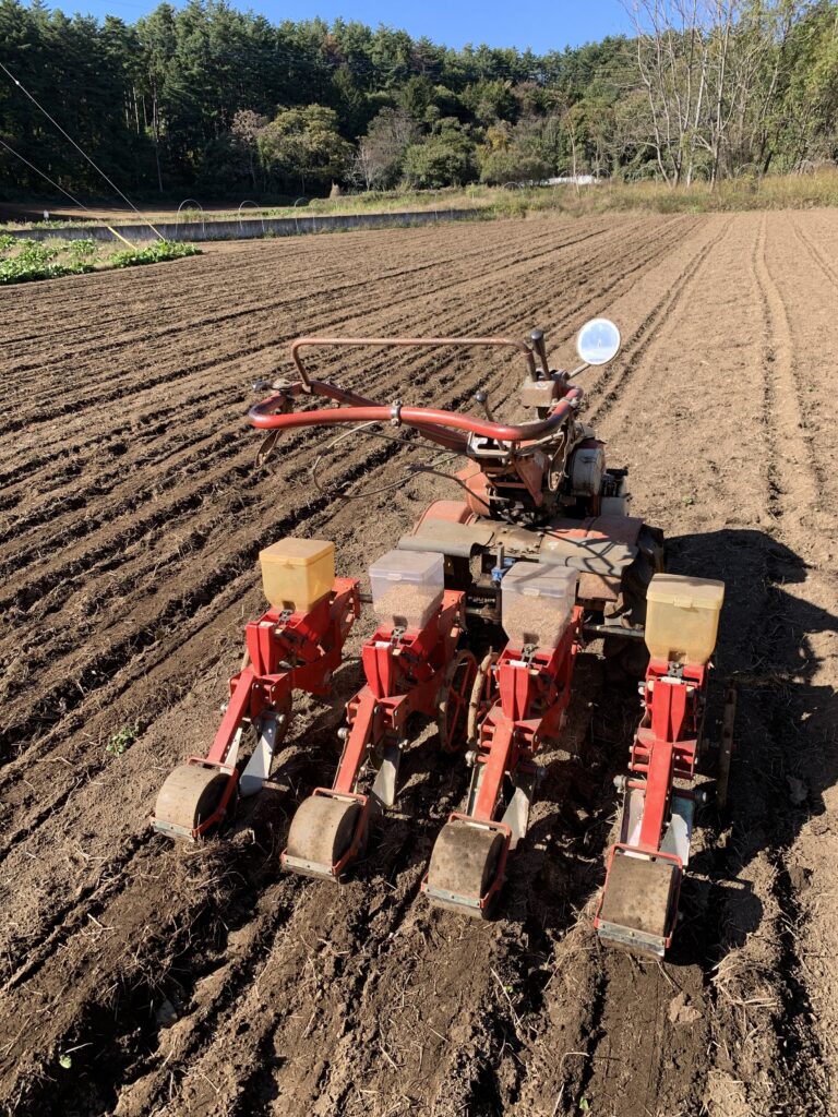 種蒔きする機械は管理機に種まき機を2連又は4連にして行います。